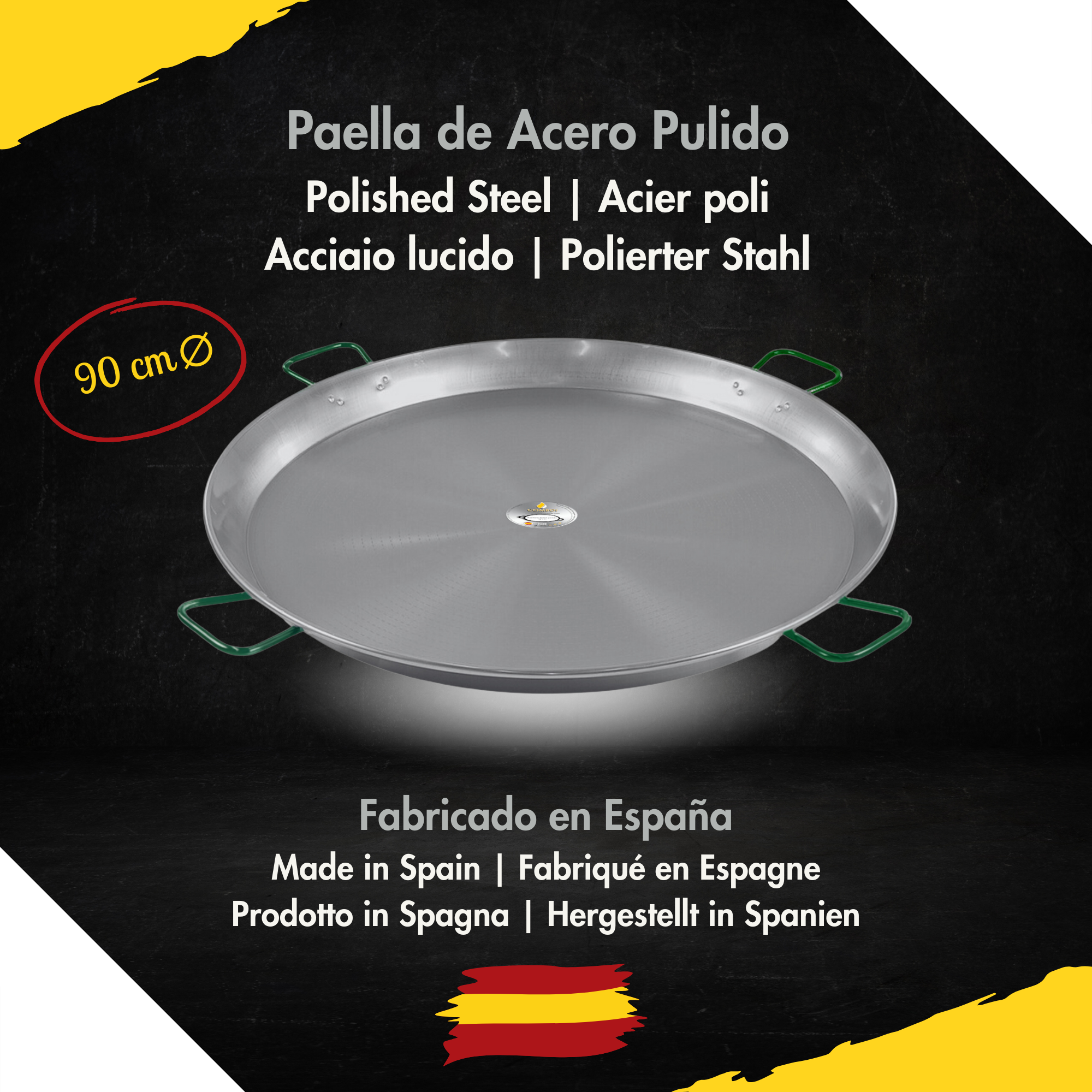 - 🥘 Una paellera de acero pulido de 90 cm de diámetro, para cocinar hasta 50 raciones, un nivel y un mandil de cocina.