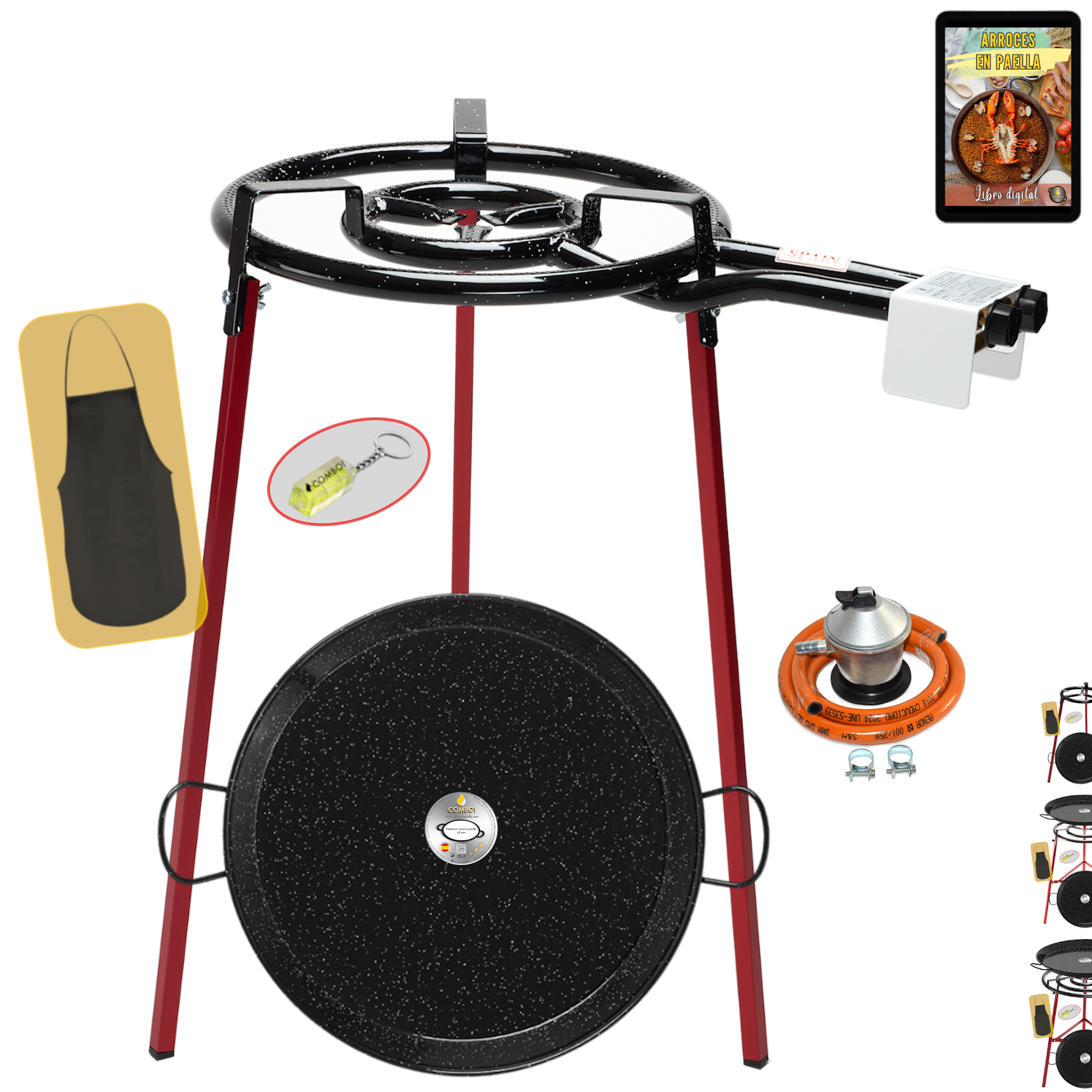 - 🔥 Paellero de gas butano de 40 cm de diámetro con dos fuegos, incluye regulador de gas, manguera homologada y soporte de juego de 3 patas.